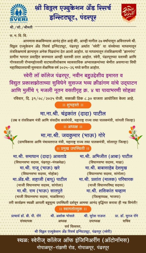पंढरपूर – तालुक्यातील गोपाळपूर येथील श्री विठ्ठल एज्युकेशन अँड रिसर्च इन्स्टिट्यूट अर्थात स्वेरी महाविद्यालयात लॉ कॉलेज, नवीन बहुउद्देशीय इमारत व विद्युत प्रकाश झोताच्या सुविधेने सुसज्ज असलेल्या क्रीडांगणाचे उद्घाटन राज्याचे उच्च व तंत्रशिक्षण मंत्री चंद्रकांत पाटील यांच्याहस्ते रविवार 31 ऑगस्ट रोजी सकाळी होणार आहे.